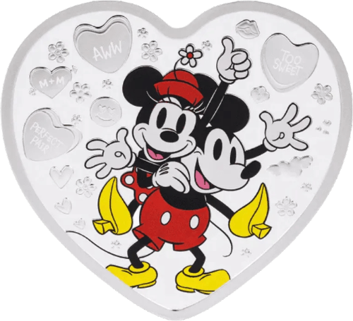 Despite not being round, this coin featuring the most well-known Disney couple is legal tender on the island nation of Niue. This heart-shaped item has a number of hearts that resemble "sweethearts candies" with messages inscribed on the front of each one.